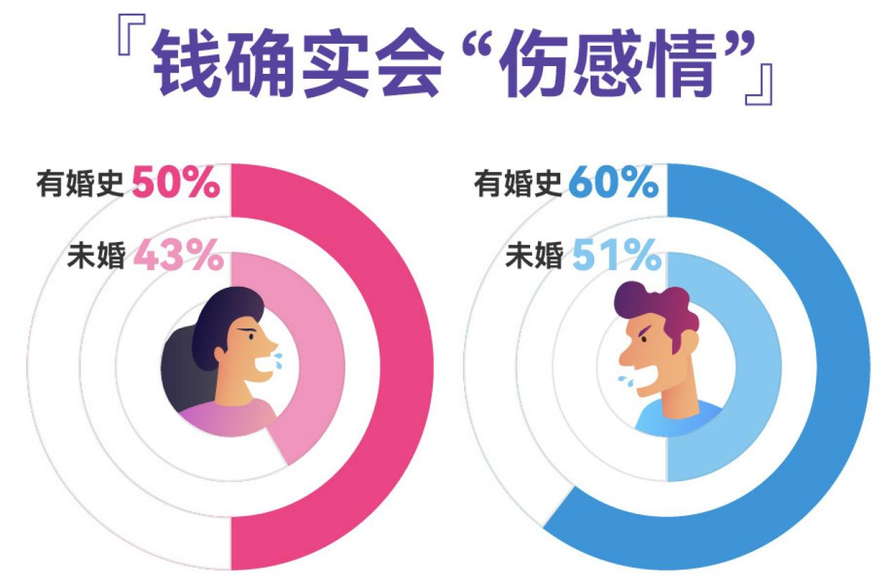 恋人间的金钱矛盾仅仅关乎钱吗?近六成单身男女承认,在解决与钱相关的问题时,自己会同时考量这段感情是否以结婚为目的。超四成单身人群会联系到感情的深浅程度,近1/3则表示会把自己爱对方的程度纳入考量。也就是说,当恋人因为金钱产生矛盾的时候,往往会伴随着更深层次的争吵。不难看出“谈钱的确伤感情”。