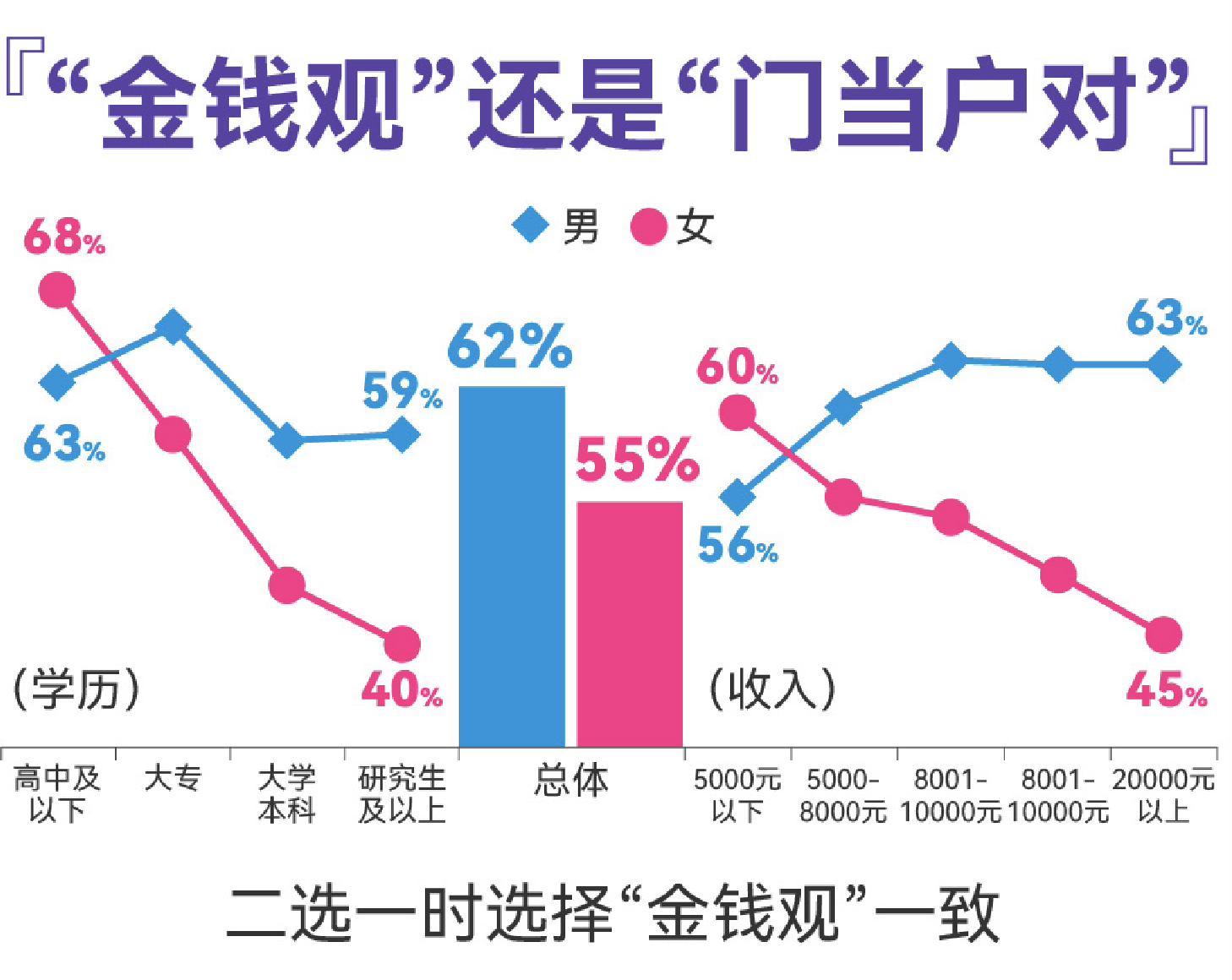 尤其当金钱观一致和门当户对只能二选一时,报告显示,62%的男性和55%的女性都选择了“金钱观一致”。