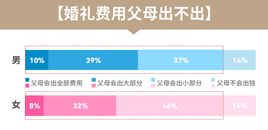 除了受传统文化的影响,婚礼所需的费用对于适婚男女、甚至两个家庭来说也是一笔不小的数字。《报告》显示:近八成适婚人群认为父母会为自己的婚礼出钱。其中,39%的男性表示自己的父母会出大部分费用,而46%的女性则认为自己的父母会出小部分费用。出资的形式增加了长辈意见的权重,也推动了适婚男女对婚礼的积极态度。
