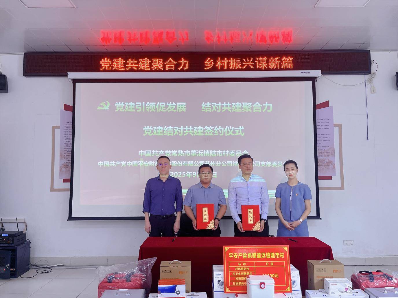 会上,平安产险常熟支公司总经理徐秋雄与陆市村党支部书记钱晓斌,在董浜镇党委副书记陆耀光与平安产险苏州分公司副总经理檀芳的见证下,正式签署党建共建协议,双方自此正式建立党建共建联动关系,使基层党组织成为乡村与金融机构的联结人,共同支持陆市村当地的发展,助力乡村振兴。